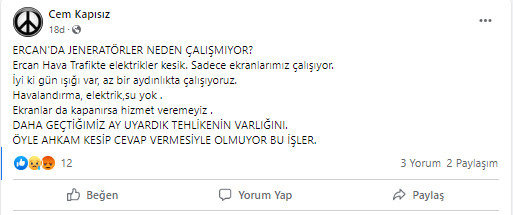Hava Trafik Kontrolörleri Sendikası (HTKS) Başkanı Cem Kapısız, sosyal medya üzerinden bir paylaşım yaparak, Ercan’da jeneratörlerin neden hala çalışmadığını sordu.
