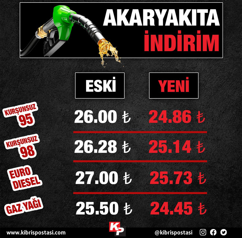 Resmi Gazete’de yayımlanan emirnameye göre, 95 oktan kurşunuz benzinin litresi 26 TL’den 24.86 TL’ye, 98 oktan kurşunsuz benzinin litresi 26.28 TL’den 25.14 TL’ye, Euro Dizelin litresi 27 TL’den 25.73 TL’ye, gazyağının litresi 25,50 TL’den 24.45 TL’ye düşürüldü.