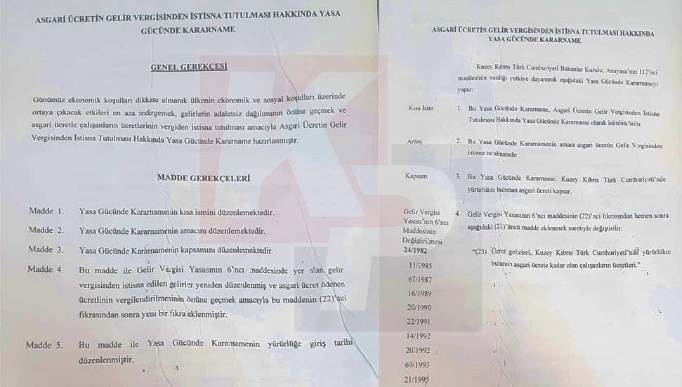 Kıbrıs Postası, Maliye Bakanlığı tarafından hazırlanan yasa gücünde kararnameyle asgari ücret vergiden muaf tutulacağı tasarı belgelerine ulaştı. Ulaşılan belgede, hazırlanan yasa gücünde kararname ile asgari ücretin gelir vergisinden istisna tutulmasının amaçlandığı vurgulandı.