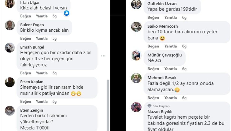 Kıbrıs Postası’nın, bu kategoride daha önceki sosyal medya paylaşımlarında 200 TL ile 10 bira veya 8 süt ya da 13 paket makarna alınabileceği; Lefkoşa-Girne arası ise 4 kez otobüs ile seyahat edilebileceği bilgisi üzerine yurttaşlar, bu acı gerçeğe adeta isyan etmişlerdi.