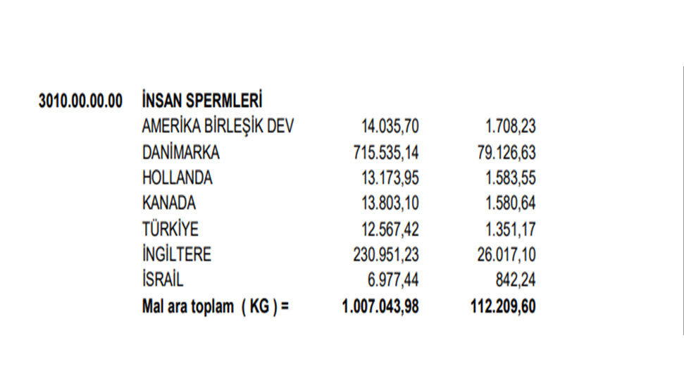 Yayınlanan raporda, sperm ithali göze çarparken, 112 bin 209 dolar 60 centlik sperm ithali gerçekleştirildi.