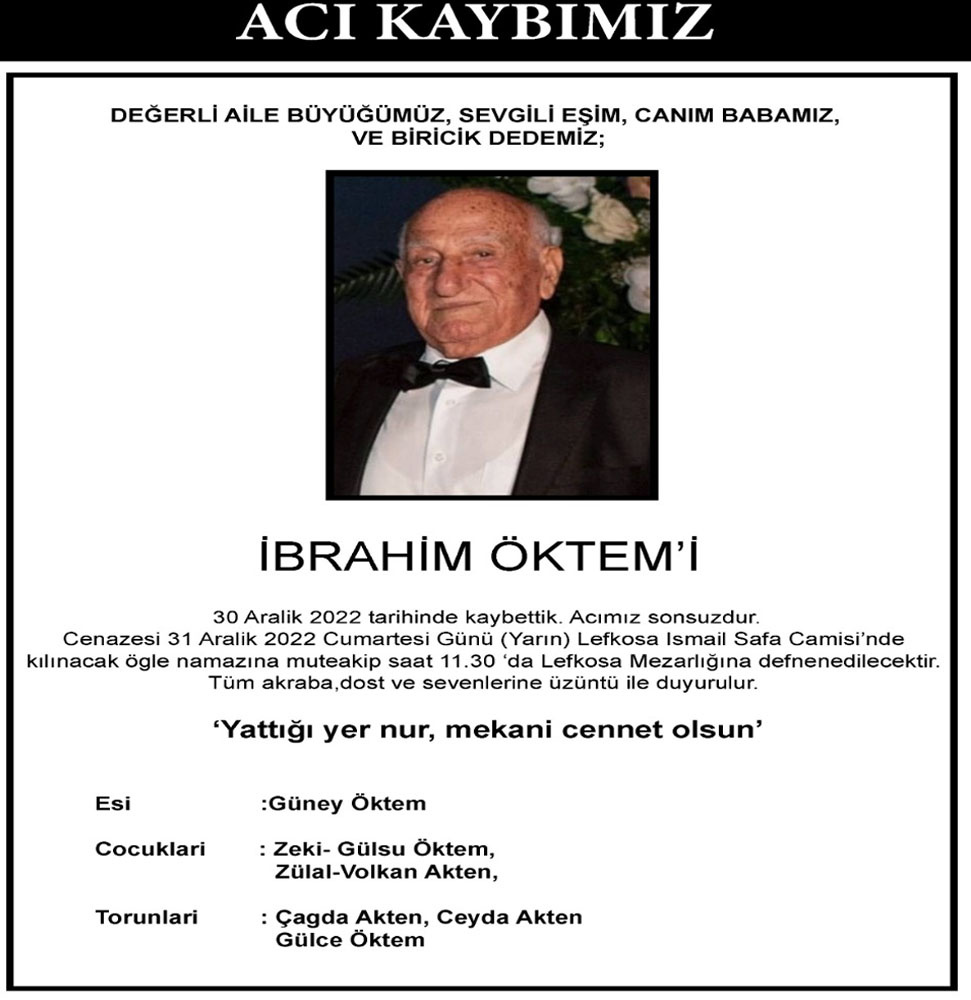 İbrahim Öktem’in cenazesi yarın Lefkoşa İsmail Safa Camii’nde kılınacak öğle namazına müteakip saat 11.30’da Lefkoşa Mezarlığı’na defnedilecek.