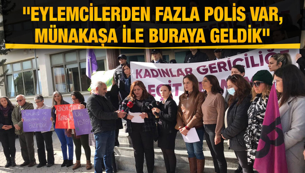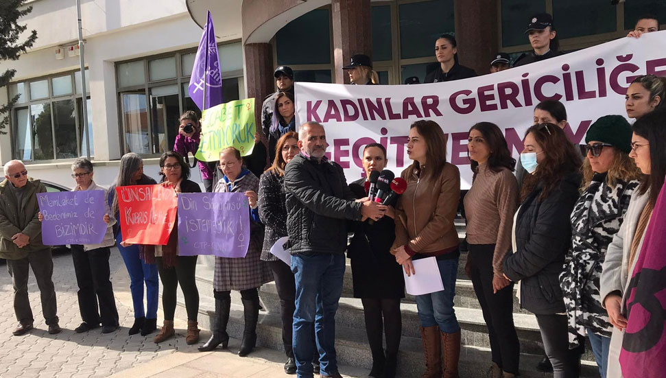 42 örgüt tarafından temsilciler düzeyinde yapılan eylemde, “Kadınlar gericiliği geçit vermiyor” pankartı açıldı; “İcabet etmiyoruz”, “Din sömürüsü istemeyik”, “Ünsal evine, Kıbrıs neyine?”, “Ezdirmem sana kendimi”, Hükümetim diyorsan Ahmetleri değil, Helinleri koru” dövizleri taşındı.