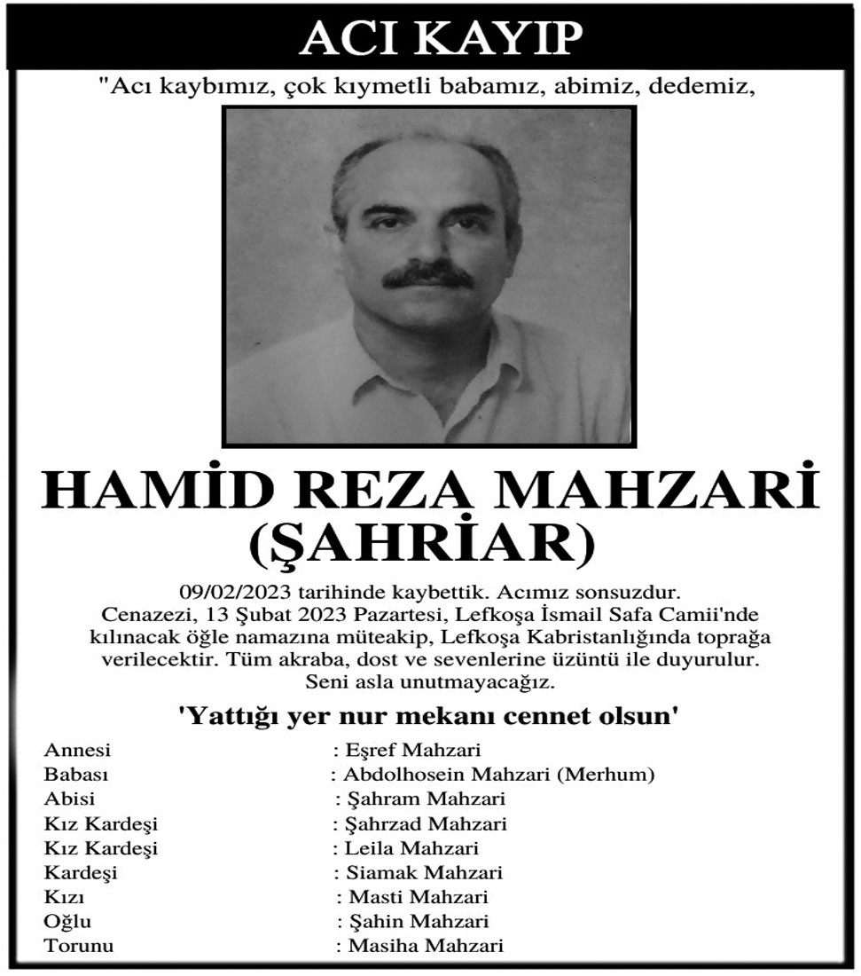 KKTC’nin sevilen simalarından Hamid Reza Mahzari, 9 Şubat 2023 tarihinde yaşamını yitirdi.