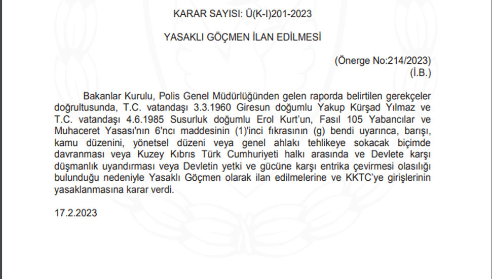 “Bakanlar Kurulu, Polis Genel Müdürlüğünden gelen raporda belirtilen gerekçeler doğrultusunda, T.C. vatandaşı3.3.1960 Giresun doğumlu Yakup Kürşad Yılmaz ve T.C. vatandaşı 4.6.1985 Susurluk doğumlu Erol Kurt’un, Fasıl 105 Yabancılar ve Muhaceret Yasası'nın 6'ncı maddesinin (1)'inci fıkrasının (g) bendi uyarınca, barışı, kamu düzenini, yönetsel düzeni veya genel ahlaki tehlikeye sokacak biçimde davranması veya Kuzey Kıbrıs Türk Cumhuriyeti halkı arasında ve Devlete karşı düşmanlık uyandırması veya Devletin yetki ve gücüne karşı entrika çevirmesi olasılığı bulunduğu nedeniyle Yasaklı Göçmen olarak ilan edilmelerine ve KKTC’ye girişlerinin yasaklanmasına karar verdi.”