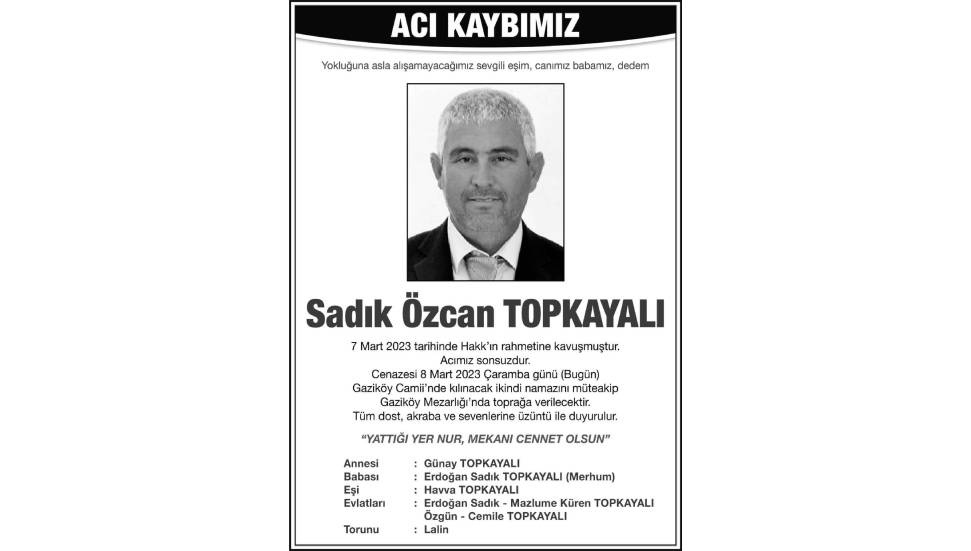 Topkayalı, yarın Gaziköy Camisi’nde kılınacak ikindi namazına müteakip Gaziköy Mezarlığı’na defnedilecek.
