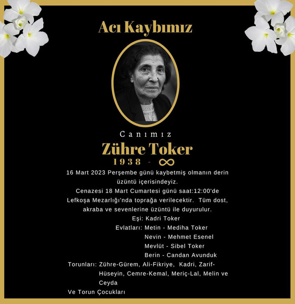 Zühre Toker’in cenazesi 18 Mart Cumartesi günü öğlen namazına müteakip kılınacak cenaze namazının ardından Lefkoşa Mezarlığı’nda toprağa verilecek.