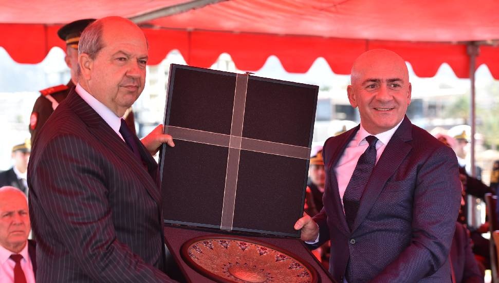 Güvenlik Kuvvetleri Komutanı Tümgeneral Zorlu Topaloğlu’nun yaptığı konuşmanın ardından Ares Tersanesi Yönetim Kurulu Başkanı Kerim Kalafatoğlu, Cumhurbaşkanı Ersin Tatar’a anı objesi sundu.