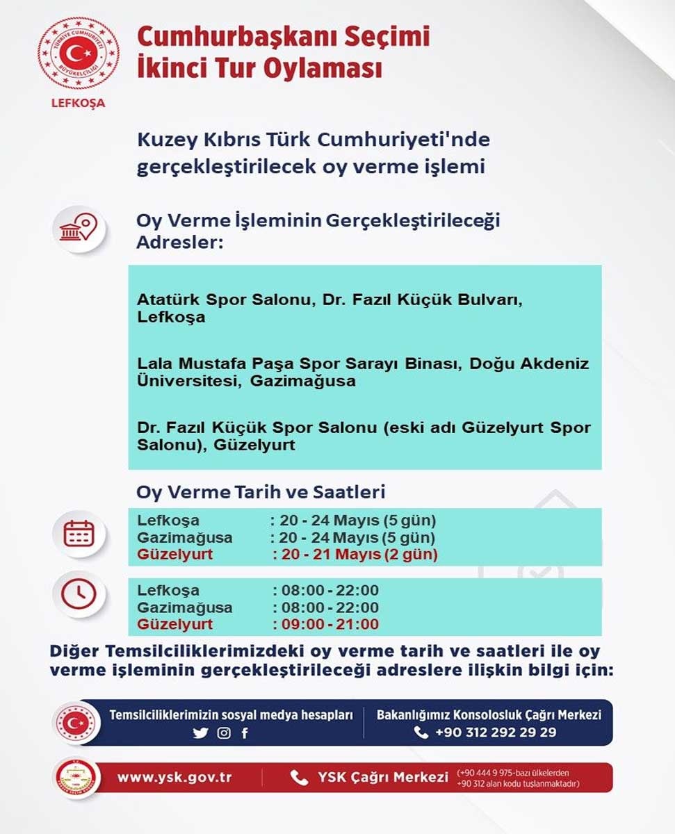 Türkiye'deki cumhurbaşkanlığı seçimlerinin ikinci turu için seçmenler, Kuzey Kıbrıs Türk Cumhuriyeti’nde 20-24 Mayıs tarihleri arasında oy kullanılabilecek. Seçmenler Lefkoşa ve Gazimağusa’da kurulan sandıklarda 5 gün, Güzelyurt’ta ise 2 gün oy kullanabilecek.