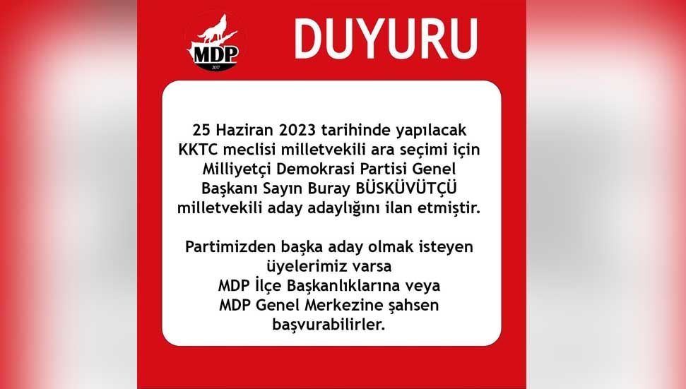 Milliyetçi Demokrasi Partisi (MDP), 25 Haziran 2023 tarihinde gerçekleştirilecek ara seçimde MDP Genel Başkanı Buray Büsküvütçü’nün aday adayı olduğunu duyurdu.