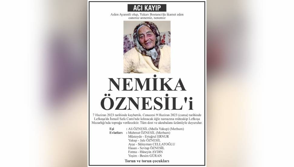 Öznesil'in cenazesi yarın İsmail Safa Camisi'nde kılınacak öğle namazının ardından Lefkoşa Mezarlığı'a defnedilecek.