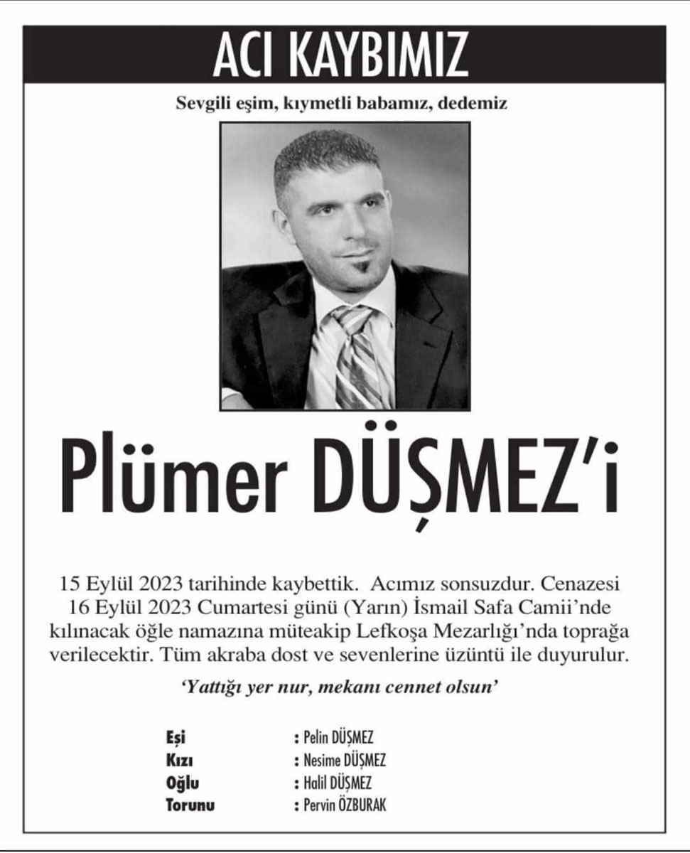 Plümer Düşmez’in cenazesi 16 Eylül Cumartesi (Yarın) kılınacak öğle namazının ardından Lefkoşa Mezarlığı’nda toprağa verilecek.