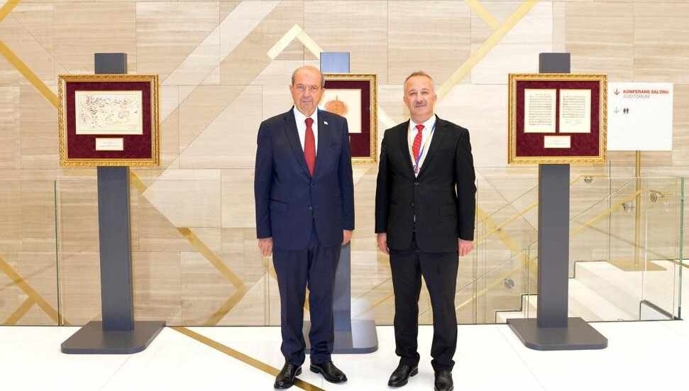 Cumhurbaşkanı Ersin Tatar’a, Türkiye Cumhuriyeti Devlet Arşivleri Başkanı Prof. Dr. Uğur Ünal eşlik ederek, 50 adet eserin yer aldığı sergi hakkında bilgi verdi.