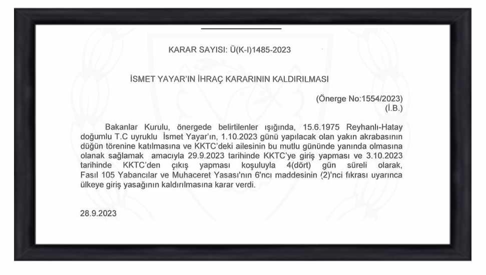 “Bakanlar Kurulu, önergede belirtilenler ışığında,15.6.1975 Reyhanlı-Hatay doğumlu TC uyruklu İsmet Yayar’ın, 1.10.2023 günü yapılacak olan yakın akrabasının düğün törenine katılmasına ve KKTC’deki ailesinin bu mutlu gününde yanında olmasına olanak sağlamak amacıyla 29.9.2023 tarihinde KKTC’ye giriş yapması ve 3.10.2023 tarihinde KKTC’den çıkış yapması koşuluyla 4 (dört) gün süreli olarak, FASIL 105 Yabancılar ve Muhaceret Yasası’nın 6’ncı maddesinin (2)’nci fıkrası uyarınca ülkeye giriş yasağının kaldırılmasına karar verdi.”