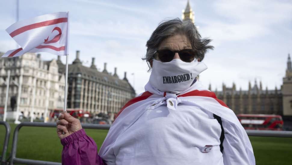 Kuzey Kıbrıs Türk Cumhuriyeti (KKTC) bayraklarının yanı sıra "Barış gücü değil, işgalci", "İngiltere Kıbrıs'ta yanıldı", "BMGK'nin 60 yıllık kararı yetti artık" yazılı pankartlar taşıyan göstericiler, yüzlerinde de "ambargolu" yazılı maskeler kullandı.