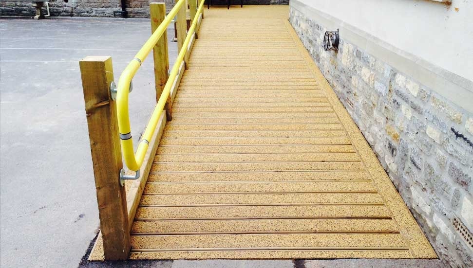 Eğimler, tekerlekli sandalye kullanıcıları ve bastonlu kişilerin rahat ve güvenli geçişini sağlamalı. 0.6 cm’ye kadar olan seviye farklılıkları için özel bir kenar düzenlemesi gerekmemektedir. 0.6 cm -1,3 cm arasındaki seviye farklılıkları 1:2’den daha fazla olmayan bir eğimle düzenlenebilir. Döşeme seviyesinden 1,3 cm'den daha fazla bir kot farkı varsa rampa düşünülmelidir. Rampa uzunlukları 9 metreye kadar olan rampaların en fazla eğimi yüzde 5 olmalıdır. Rampaların eğimi, kullanan kişilerin güvenliği açısından büyük önem taşımaktadır.