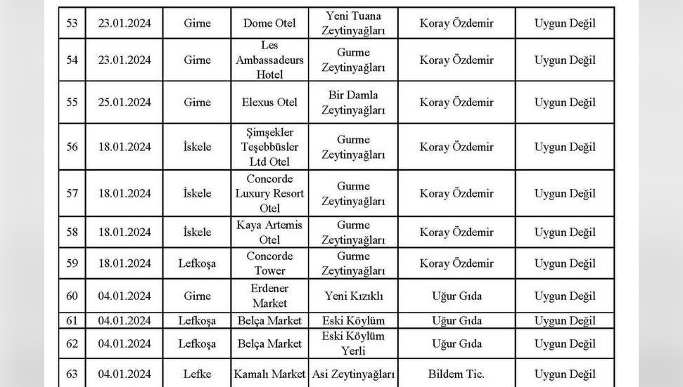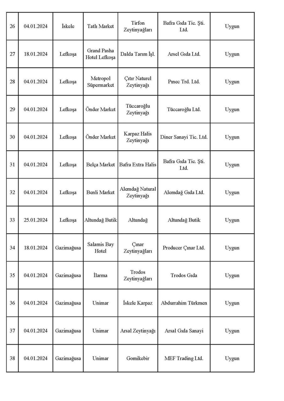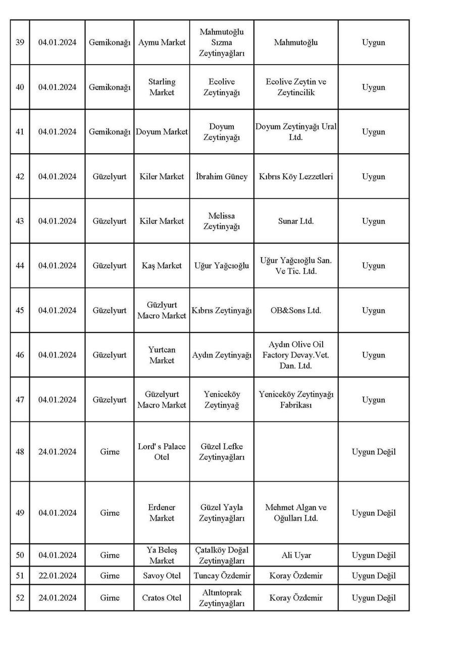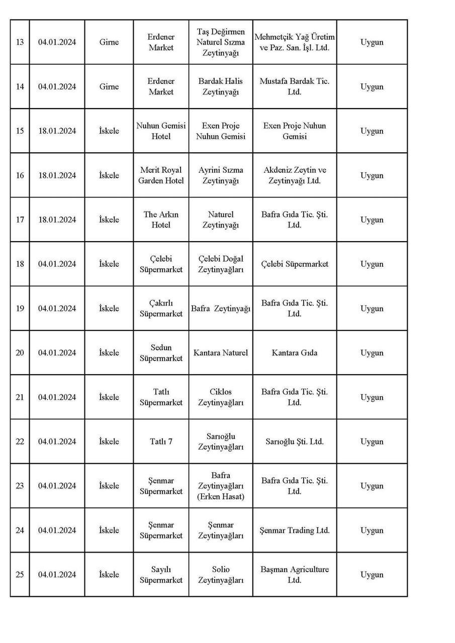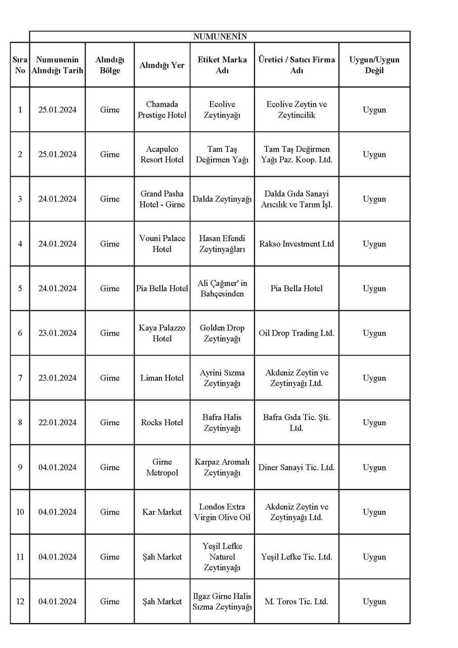 Kıbrıs Postası, 66 örnekten piyasada yoğun miktarda bulunan 19 numunenin sahte çıktığı, bu ürünlerin çoğunun market ve otellerden alındığı, alım yoğunluğu nedeniyle tağşişli olanlarının çoğunun da otellerden elde edildiğini kamuoyuna duyurmuştu... Ayrıca bakanlık son yaptığı açıklamasında, Sinde Trading'in ürettiği zeytinyağının tağşişli çıktığını söyledi. Bakanlık bu defa, 04 – 25 Ocak 2024 tarihleri arasında yapılan denetimdeki zeytinyağı analiz sonuçlarını yayımladı.