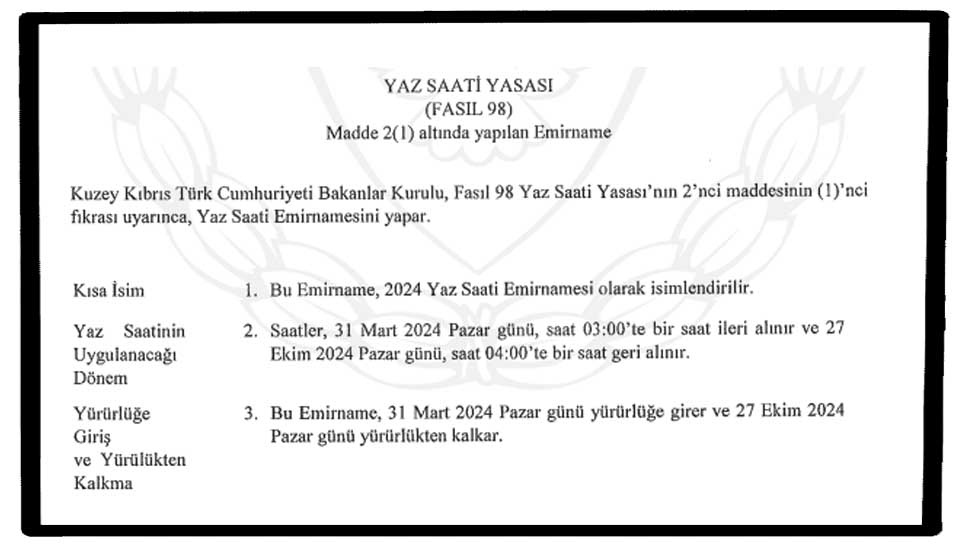 “Kuzey Kıbrıs Türk Cumhuriyeti Bakanlar Kurulu, Fasıl 98 Yaz Saati Yasası'nın 2'nci maddesinin (l)'nci fıkrası uyarınca, Yaz Saati Emirnamesini yapar.