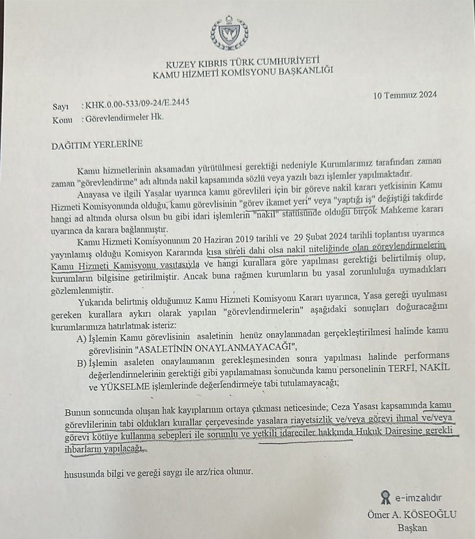 Kamu Hizmeti Komisyonu (KHK) UBP-DP-YDP hükümetini nakiller konusunda uyardı. Başkan Ömer Köseoğlu imzalı yazıda, nakil niteliğinde olan görevlendirilmelerin Kamu Hizmet Komisyonu aracılığıyla ve belli kurallar çerçevesinde yapılması gerektiği hatırladı.