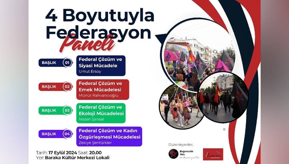 Dört temel başlıktan oluşacak olan panelde, “Federal Çözüm ve Siyasi Mücadele” konu başlığında Bağımsızlık Yolu Genel Sekreteri Umut Ersoy, “Federal Çözüm ve Emek Mücadelesi” konu başlığında Bağımsızlık Yolu Mali Sekreteri Münür Rahvancıoğlu, “Federal Çözüm ve Ekoloji Mücadelesi” konu başlığında Baraka Kültür Merkezi aktivisti Nazen Şansal, “Federal çözüm ve Kadın Özgürleşmesi Mücadelesi” konu başlığında Baraka Kültür Merkezi Yönetim Kurulu Üyesi Zekiye Şentürkler konuşmacı olarak yer alacaklar.