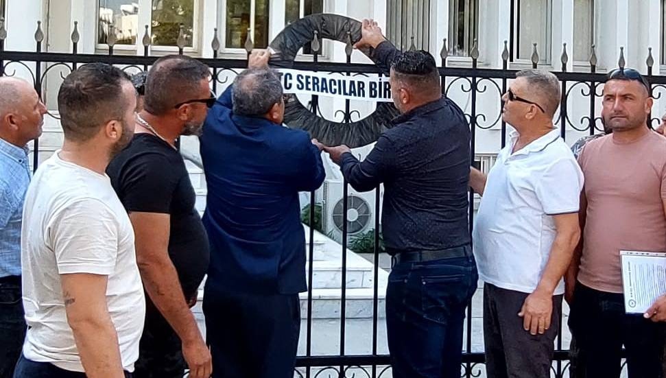 Seracılar Birliği, Bayındırlık ve Ulaştırma Bakanlığı’na siyah çelenk bırakarak, Bakan Erhan Arıklı’nın “meyve ve sebze ithalatının serbest bırakılacağı” açıklamasını protesto etti. Eyleme, Kıbrıs Türk Çiftçiler Birliği de destek verdi.