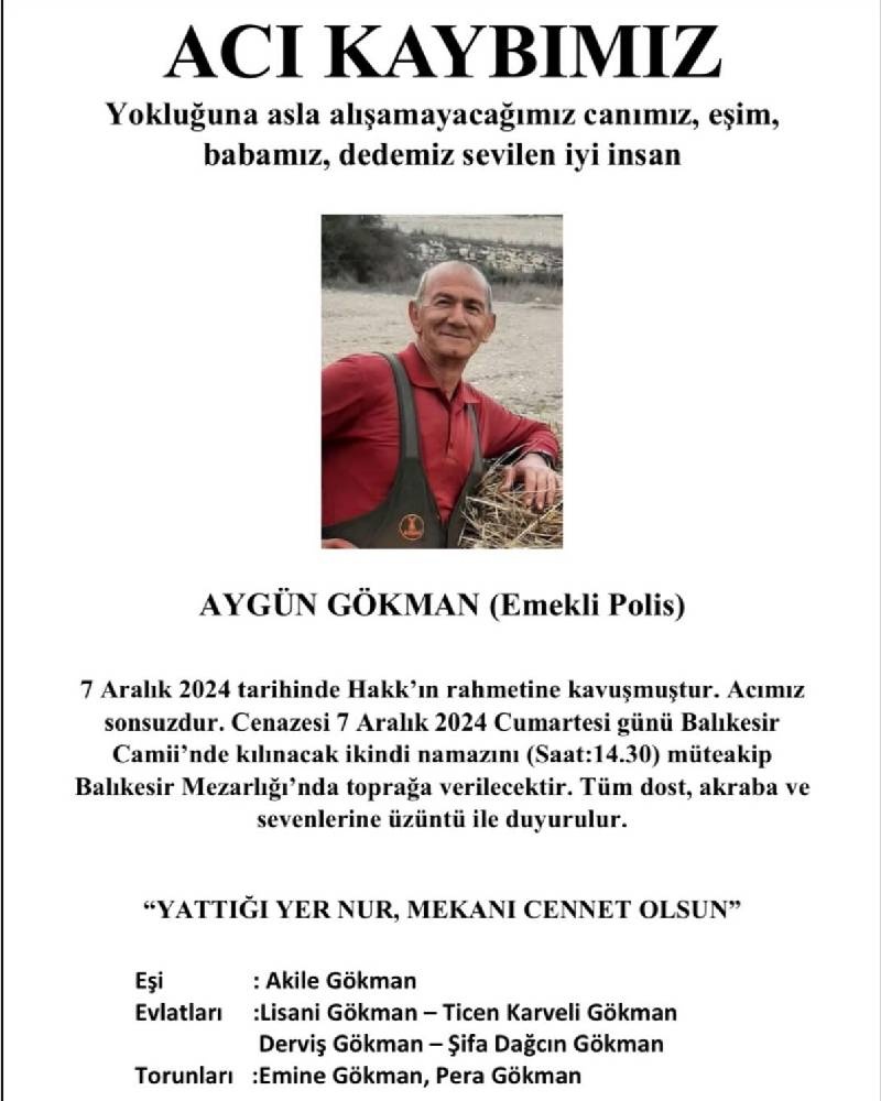 Aygün Gökman, bugün Balıkesir Camisi’nde kılınacak ikindi namazına müteakip Balıkesir Mezarlığı’nda son yolculuğuna uğurlanacak.