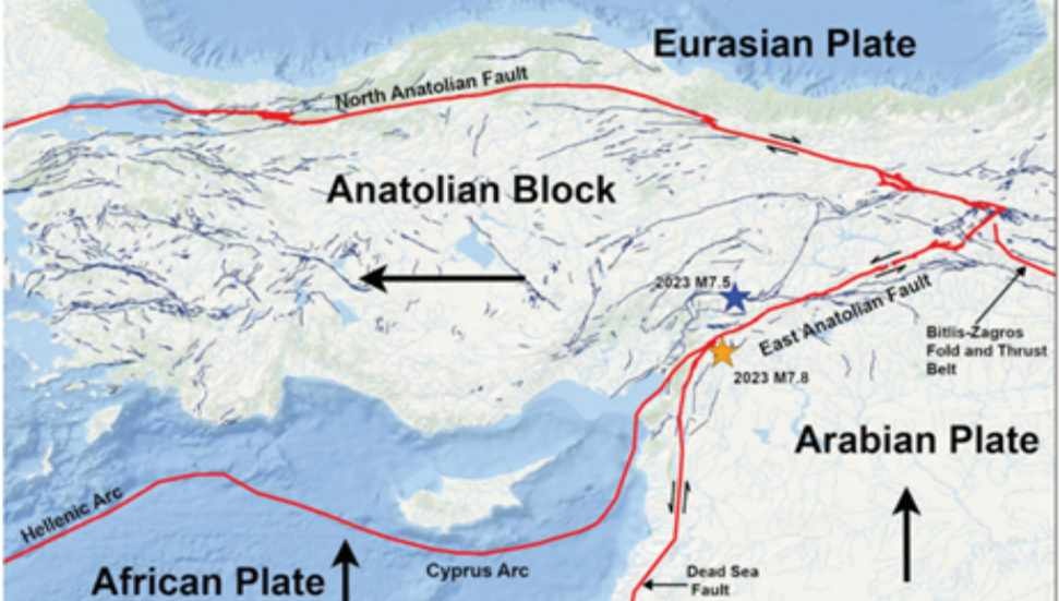 Şekil 1- Kıbrıs Yayı, Şubat 2023'te meydana gelen Kahramanmaraş ve Hatay depremlerinin oluşmasına sebep olan Afrika, Arap ve Avrasya levhalarının kesişim noktasına yakın bir konumda yer almaktadır.