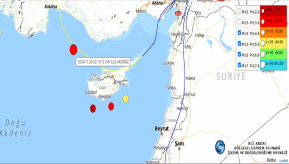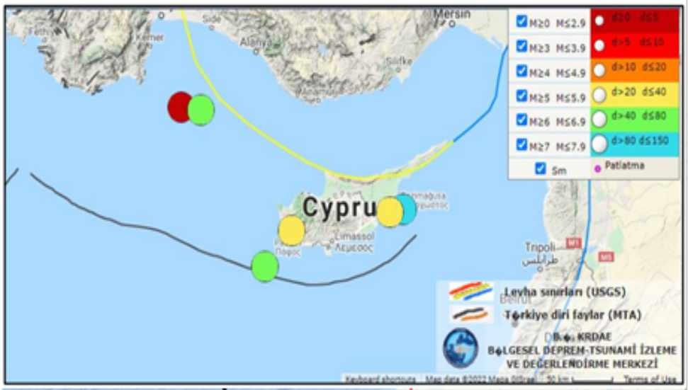 Şekil 3 - Kıbrıs çevresinde son bir ay içerisinde meydana gelen Mw>4 olan depremler (Boğaziçi Üniversitesi Kandilli Rasathanesi Ve Deprem Araştırma Enstitüsü, Bölgesel Deprem-Tsunami İzleme Ve Değerlendirme Merkezi verilerinden alıntıdır)