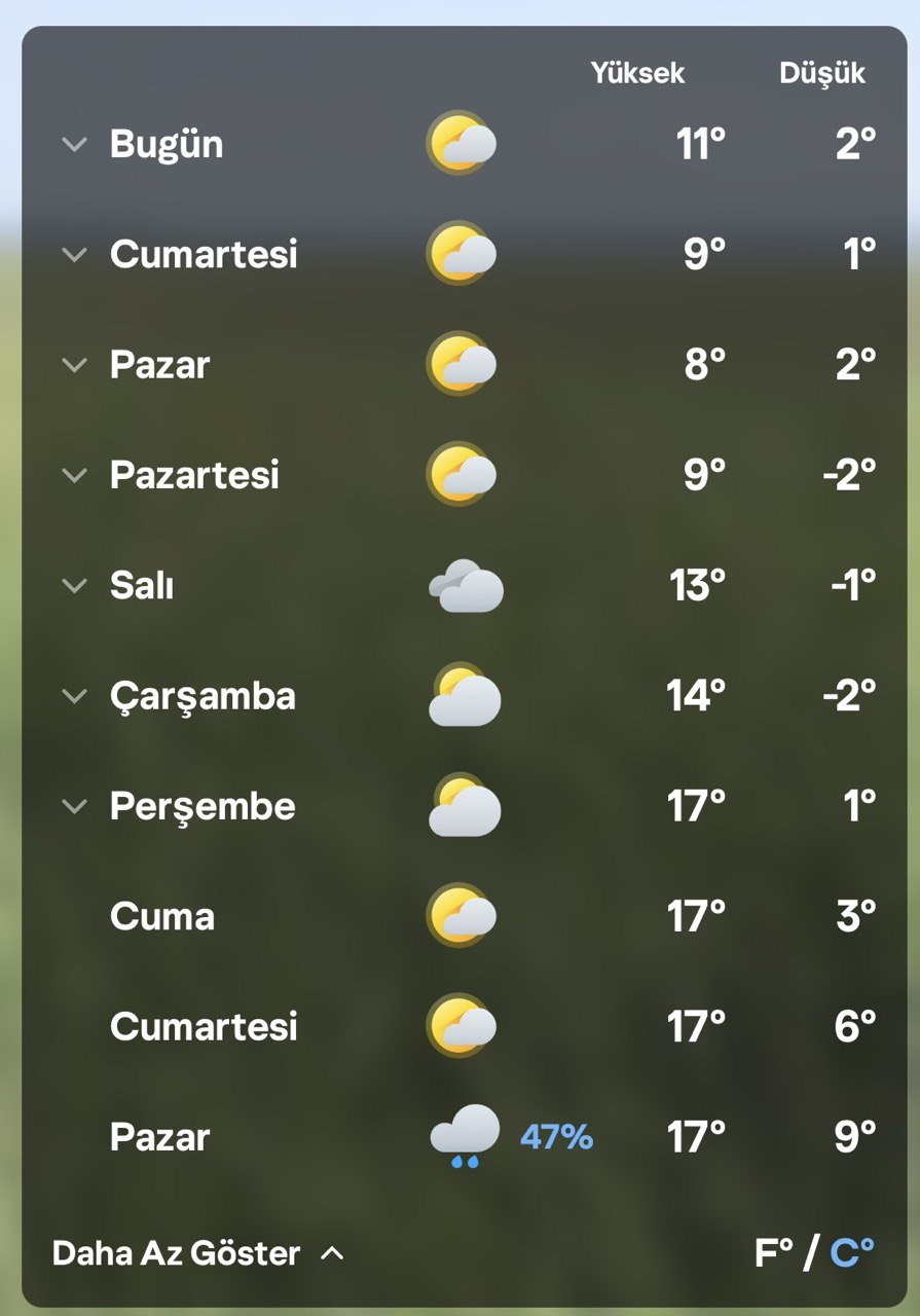 Gündüz 16-17, gece sıcaklıkları ise önümüzdeki hafta sonuna doğru 6-9 derece seviyelerine yükselerek daha ılıman bir seyir gösterecek.
