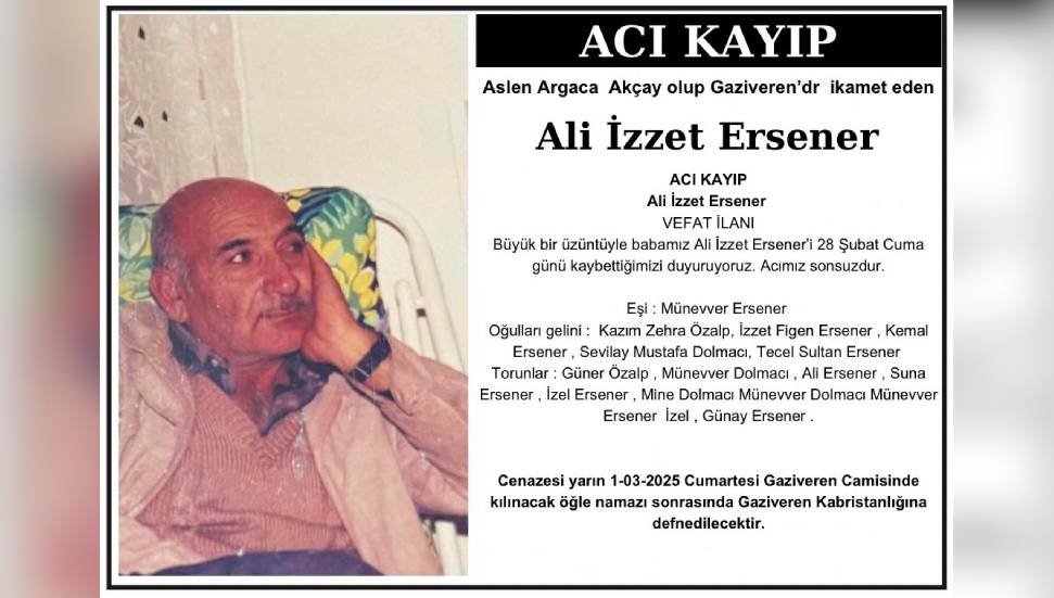 Ersener, yarın Gaziveren Camisi’nde kılınacak öğle namazı sonrasında Gaziveren Kabristanlığı’nda defnedilecek.
