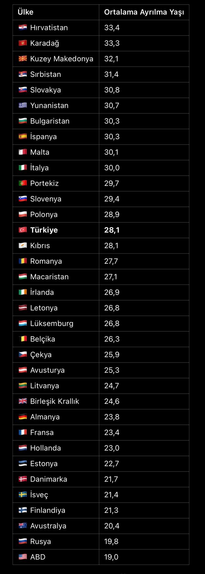 Gençlerin ailelerinden bağımsız bir hayat kurmaları, ülkelerin ekonomik, kültürel ve sosyal dinamiklerine göre değişiyor. Avrupa İstatistik Ofisi (Eurostat), ABD Ulusal Gençlik Uzunlamasına Araştırması ve diğer ulusal istatistik kurumlarının verilerine göre hazırlanan liste, gençlerin ortalama kaç yaşında aile evinden ayrıldığını ortaya koydu.