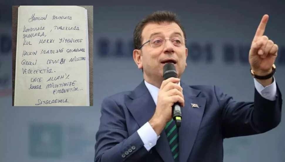 İstanbul Büyükşehir Belediye Başkanı Ekrem İmamoğlu, terör, yolsuzluk ve rüşvet soruşturmaları kapsamında gözaltına alınmasının ardından yayımladığı notta, "Yapılan yanlışlara, kumpaslara, tuzaklara, yalanlara, kul hakkı yiyenlere, halkın iradesini çalanlara gerekli cevabı milletimiz verecektir" ifadelerini kullandı.