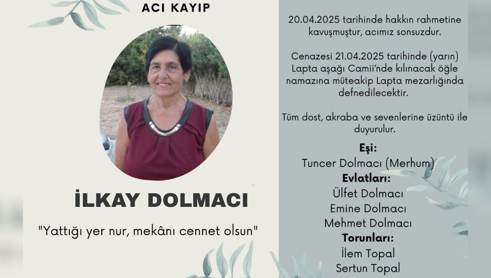 İlkay Dolmacı’nın vefatı büyük üzüntü yarattı. Cenazesi, 21 Nisan Pazartesi günü Lapta Aşağı Camii'nde kılınacak öğle namazının ardından Lapta Mezarlığı’na defnedilecek.
