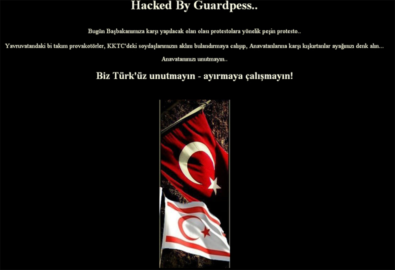 Başbakanlık'ın resmi web sitesini erişime engelleyen Guardpress adlı grup, sitenin ana sayfasına koydukları notta, "Yavruvatandaki bi takım provakotörler, KKTC'deki soydaşlarımızın aklını bulandırmaya calışıp, Anavatanlarına karşı kışkırtanlar ayağınızı denk alın... Anavatanınızı unutmayın" yazdı.