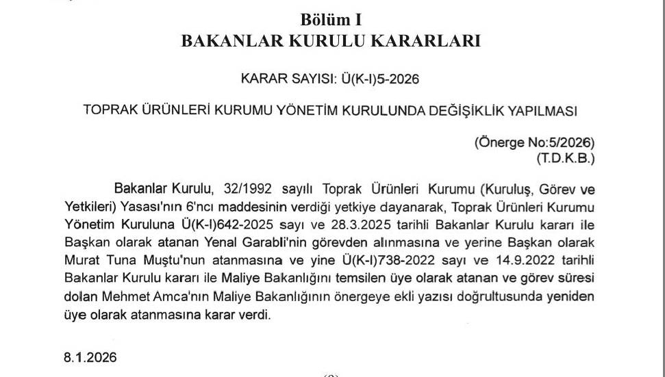 Bakanlar Kurulu, Toprak Ürünleri Kurumu (TÜK) Yönetim Kurulu’na başkan olarak atanan Yenal Garabli’nin görevden alınmasına yerine ise Murat Tuna Muştu’nun atanmasına karar verdi.