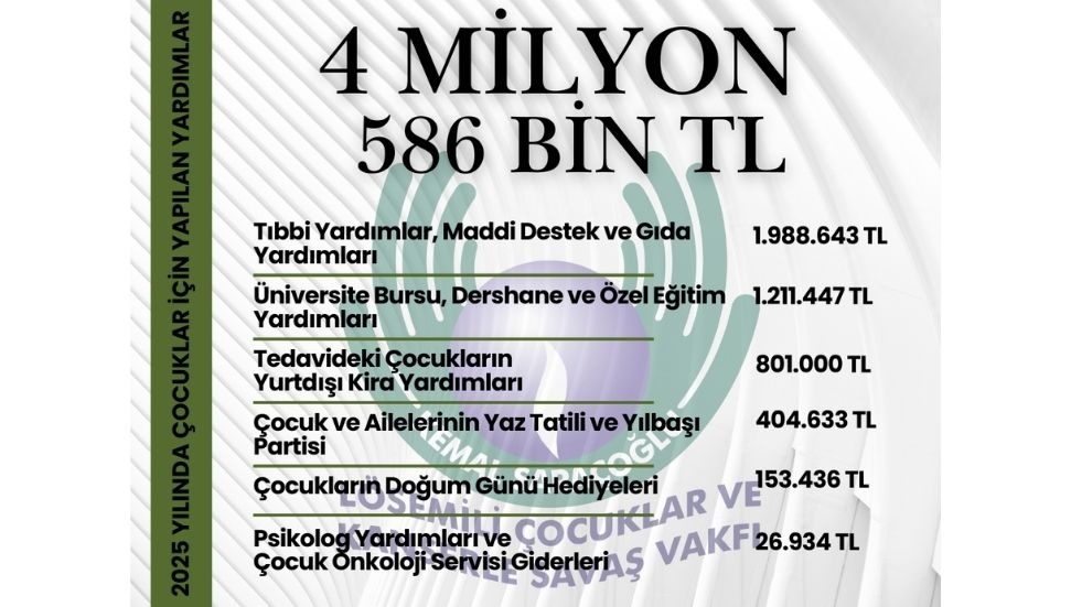 Açıklamada, üyeler ve aileler için psikolog desteği, yılbaşı etkinliği, üye çocukların yıllık tatil etkinliği, çocuk onkoloji-hematoloji servis giderleri, gıda ve temel ihtiyaç yardımları, maddi destek yardımları, ilaç yardımları, üyelerin doğum günü hediyeleri, eğitim destek bursları ve özel eğitim yardımları, yurtdışı kira yardımları ile sevk, tıbbi ve tetkik destekleri kapsamında toplam 4 Milyon 586 bin TL’lik harcama yapıldığı belirtildi.