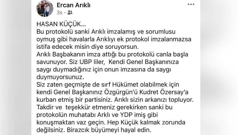 Ercan Arıklı, açıklamasının sonunda, “Arıklı sizin arkanızı topluyor. Takdir ve teşekkür etmeniz gerekirken sanki bu protokolün muhatabı Arıklı ve YDP imiş gibi konuşmaktan vazgeçin. Hep Küçük kalmak zorunda değilsiniz. Birazcık büyümeyi hayal edin” sözlerine yer verdi.