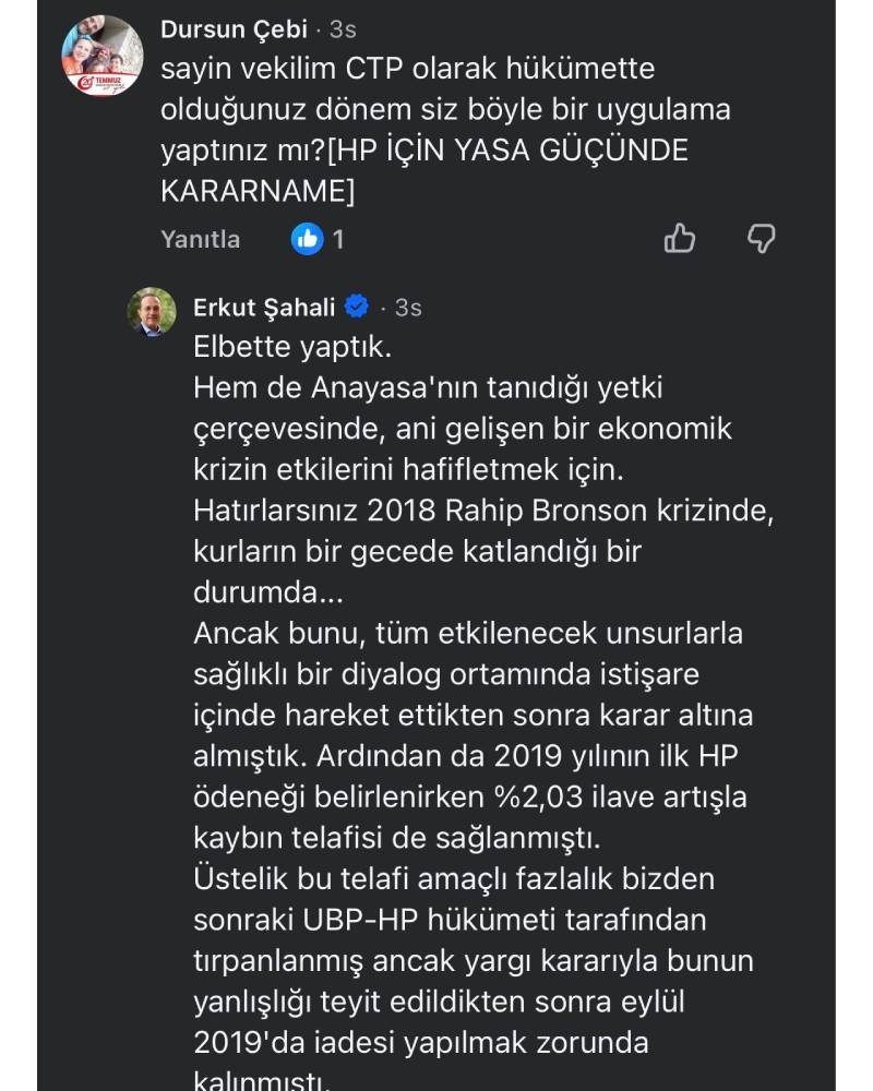 Şahali, CTP’nin 4'lü hükümette olduğu dönemde benzer bir uygulamanın yapıldığını belirterek, bunun Anayasa’nın tanıdığı yetki çerçevesinde ve ani gelişen ekonomik krizin etkilerini hafifletmek amacıyla hayata geçirildiğini ifade etti.