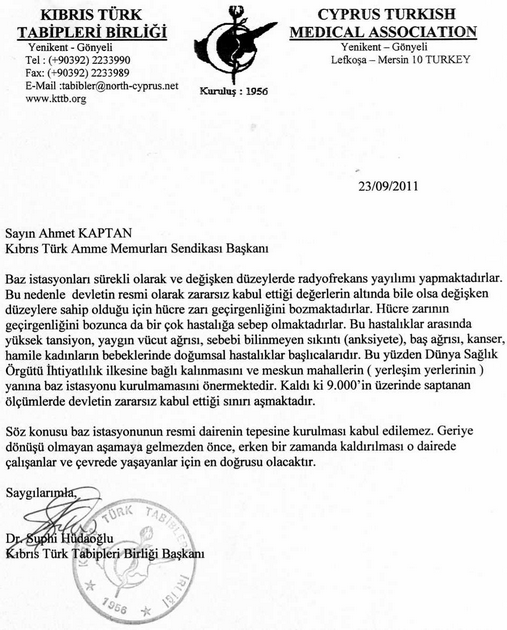 Kıbrıs Türk Tabipler Birliği, devletin bir kurumu olan resmi dairenin çatısına dikilen Turkcell 3G baz istasyonu ile ilgili Telekomünikasyon Dairesi'nin raporunu değerlendirerek, yeni bir değerlendirme raporu hazırladı. Öte yandan, baz istasyonunun kurulduğu dönemde, dairede 3 bayan personelin hamile oldukları öğrenilirken, ciddi risk altında oldukları konusunda uyarıda bulunuldu.