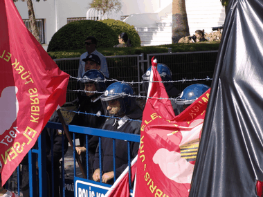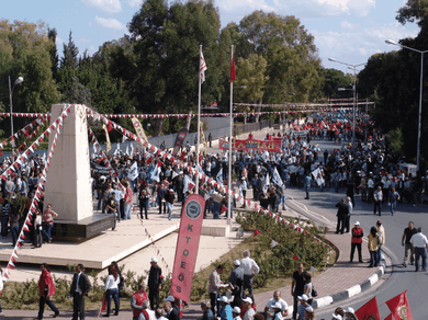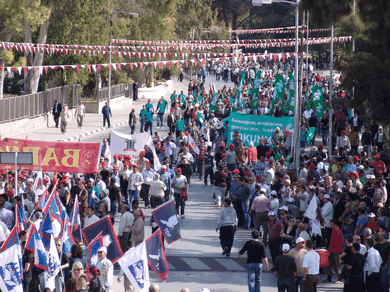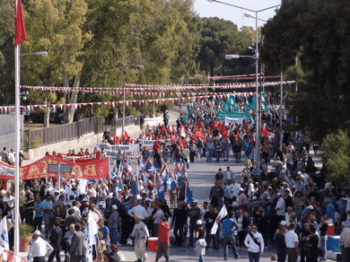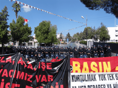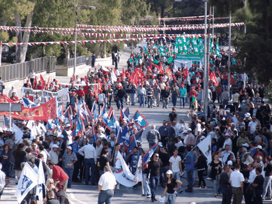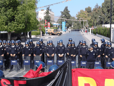 <P>Sendikal Platform'un, bazı siyasi partiler ve sivil toplum örgütlerinin desteğiyle düzenlediği miting, Lefkoşa'da Şehitler Abidesi ile Meclis civarında yapıldı. Miting dolayısıyla polis geniş güvenlik önlemleri aldı. Eski PEYAK binası civarında toplanan değişik sendikaların, partilerin ve örgütlerin bayrakları altında, marşlarla miting alanına giren eylemciler, sosyal güvenlik ve sosyal sigortalarla ilgili yasa değişikliklerine, özelleştirmelere ve hükümetin birçok icraatına tepki gösterdi. Meclis civarındaki bazı yollar trafiğe kapatılırken, Şehitler Anıtı civarına demir bariyer çekildi. Zırhlı kıyafetli polisler de Meclis etrafında görevlendirildi.</P>