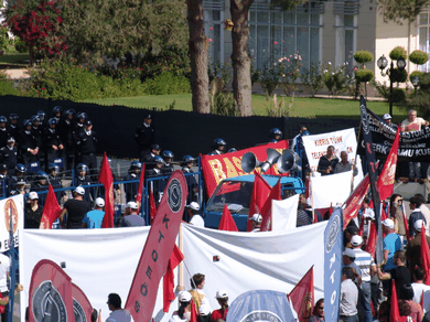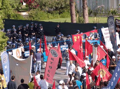 Eski PEYAK binası civarında toplanan değişik sendikaların, partilerin ve örgütlerin bayrakları altında, marşlarla miting alanına giren eylemciler, sosyal güvenlik ve sosyal sigortalarla ilgili yasa değişikliklerine, özelleştirmelere ve hükümetin birçok icraatına tepki gösterdi.