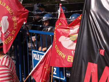 Geçmiş eylemlerde polisin etten duvar ördüğü meclis önünde bugün daha geniş önlem alınarak, demir barikat kuruldu. Polisler üzeri dikenli tellerle kaplı demir barikatın arkasına dizildi.