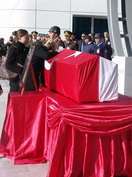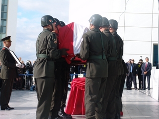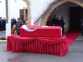 Eroğlu'nun konuşmasının ardından Denktaş'ın naaşı Cumhurbaşkanlığı Şeref Salonu'na götürüldü ve katafalka konuldu. Cumhurbaşkanlığında naaş önünden yarın 09:00'a kadar saygı geçişi yapılacak.