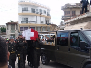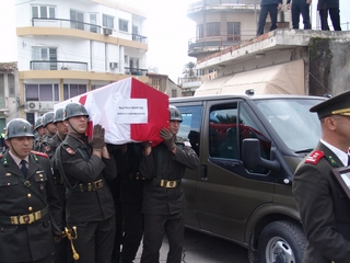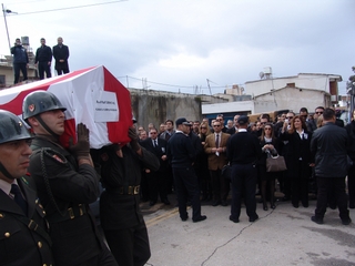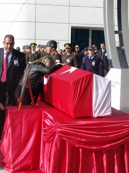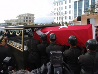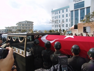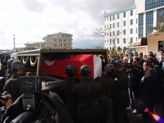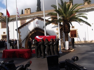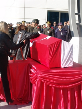 KKTC ve TC bayraklarına sarılı olarak askerlerin omuzunda taşınan Rauf Denktaş'ın tabutu, YDÜ Hastanesi önüne konuldu.