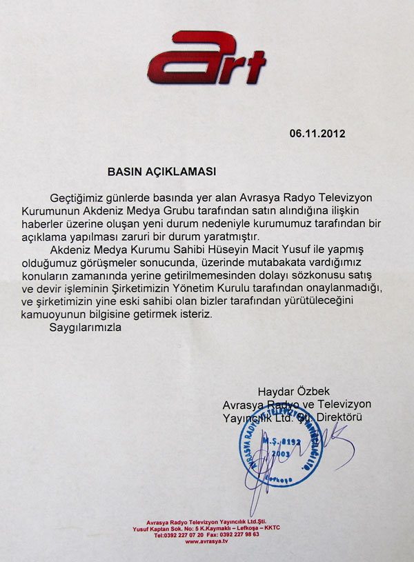 Avrasya Radyo Televizyon Kurumu (ART) İşadamı Hüseyin Macit Yusuf tarafından satın alınacağı ve Akdeniz Medya Grubu'na dahil edileceği ile ilgili imzalar atılmasının ardından, ART Radyo TV Direktörü Haydar Özbek devrin gerçekleşmediğini açıkladı!