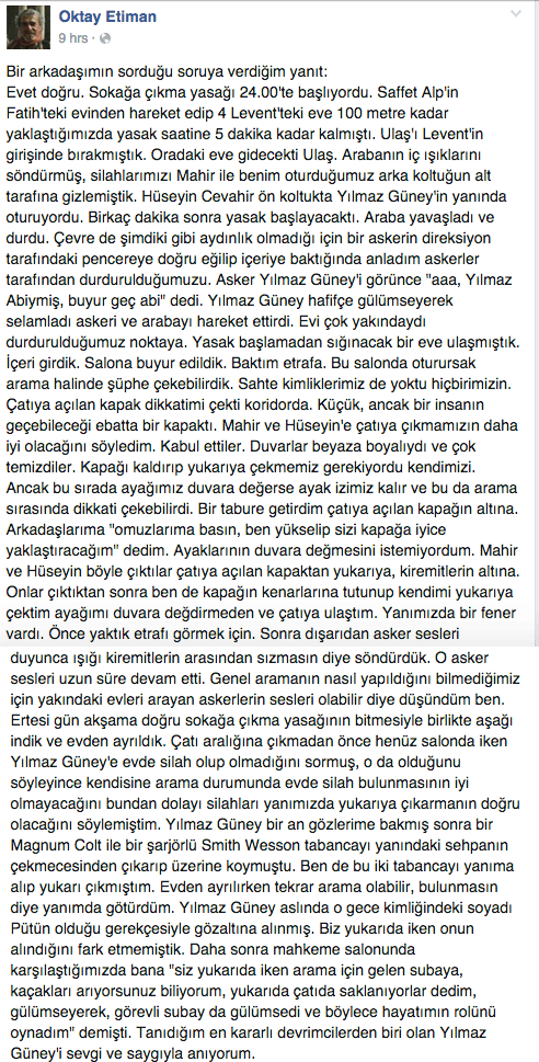 Türkiye Devrimci hareketinin önemli isimlerinden Mahir Çayan'ın hayatta kalan son arkadaşlarından Oktay Etiman kişisel Sosyal Medya hesabından Yılmaz Güney ile ilgili bir anektod paylaştı.