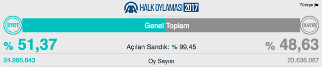 Şu ana kadar tüm sandıkların yüzde 99.45'i açıldı. Sonuçlara göre evet yüzde 51.37, hayır 48.63.
