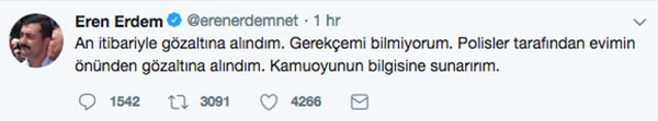 "An itibariyle gözaltına alındım. Gerekçemi bilmiyorum. Polisler tarafından evimin önünden gözaltına alındım. Kamuoyunun bilgisine sunarırım."