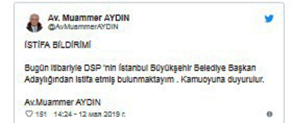 Aydın, Twitter hesabından yaptığı açıklamada, "Bugün itibariyle DSP'nin İstanbul Büyükşehir Belediye Başkan adaylığından istifa etmiş bulunmaktayım" dedi.