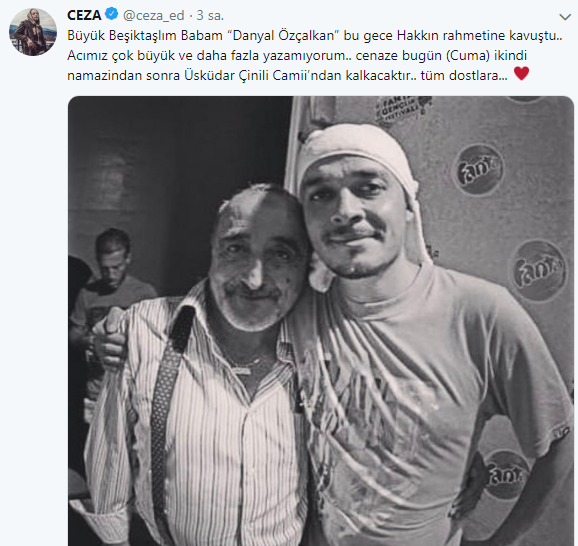 "Büyük Beşiktaşlım Babam 'Danyal Özçalkan' bu gece Hakkın rahmetine kavuştu" diye yazan Ceza, "Acımız çok büyük ve daha fazla yazamıyorum. Cenaze bugün (CUMA) ikindi namazından sonra Üsküdar Çinili Camii nden kalkacaktır. Tüm dostlara" ifadelerini kullandı.